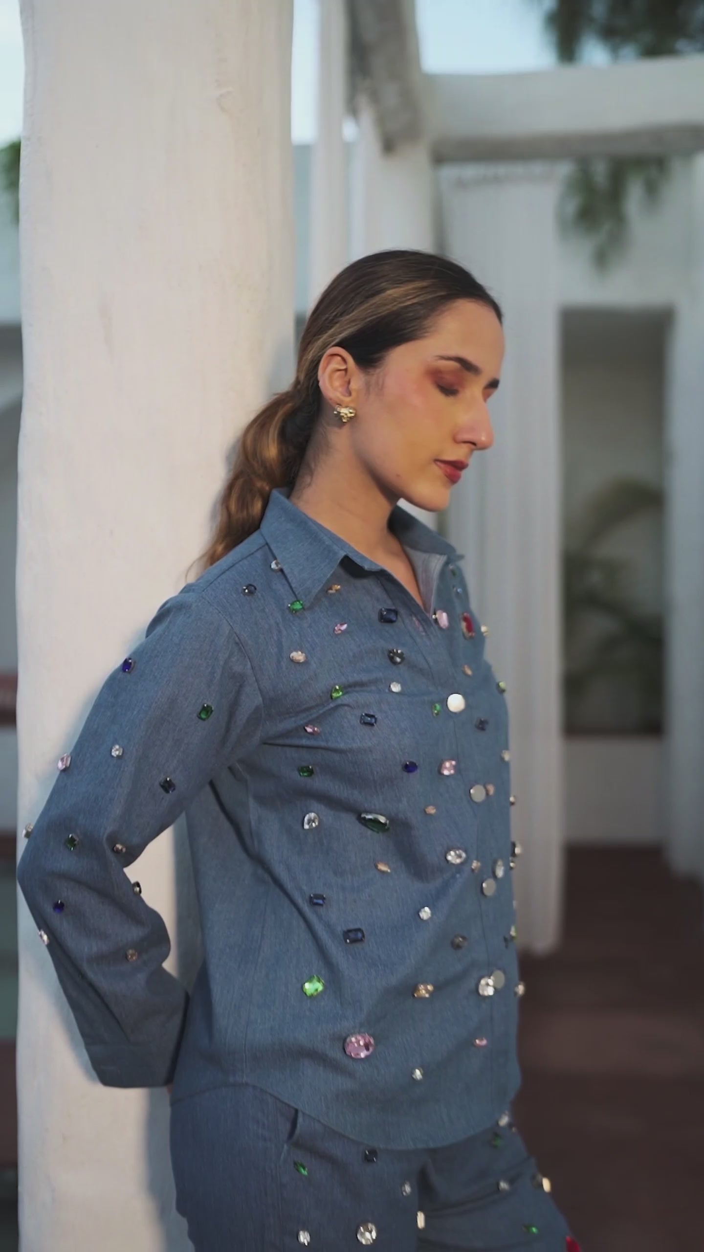 Dazzle under the light and capture every eye with this electrifying blue denim co-ord set. It's magnificently studded with a constellation of multicolored stones that brilliantly catch and reflect every glimmer, all set on a relaxed silhouette that seamlessly merges comfort with bold, captivating embellishment.